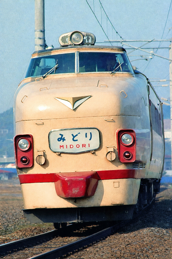 | No.N8304‐28 1983年3月7日 門ミフ クロ481[51‐57]他 4両 みどり 佐世保線 大町←肥前山口 博多・佐世保/奇 クロ481[51‐57]+モハ485+モハ484+クハ481[201‐263] 早岐 佐世保線の特急「みどり」。ヒゲなしクロ,文字ヘッドマーク。今となってはシンプルなヘッドマークが新鮮に感じられます。クロ481‐50番台は1968年に7両がサロ481から改造され,ヨンサントウ改正で奥羽本線の特急「やまばと」で使われました。1975年に7両とも九州に転じましたが撮影時点で52と53が廃車となっていました。 (2005/04/10追加 2023/07/09ワイド化 2026/02/28 ChatGPTで手前の草削除) |