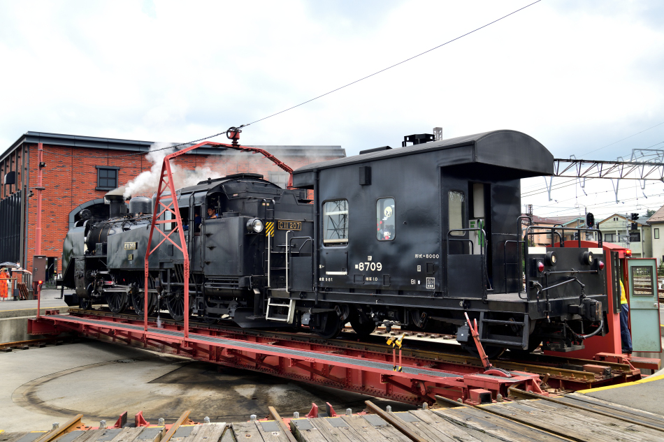 | No.D850_240915-084 2024年9月15日 C11 207+ヨ8709 東武鉄道 下今市機関区 扇形機関庫3番線への後退に向けゆっくりと転車台の位置合わせが行われます。 |