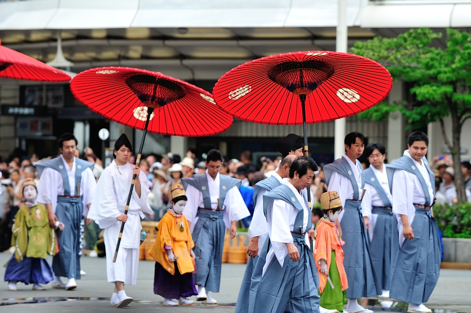巡行では烏帽子・仮衣姿の六人の稚児が先導役となる