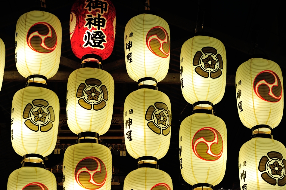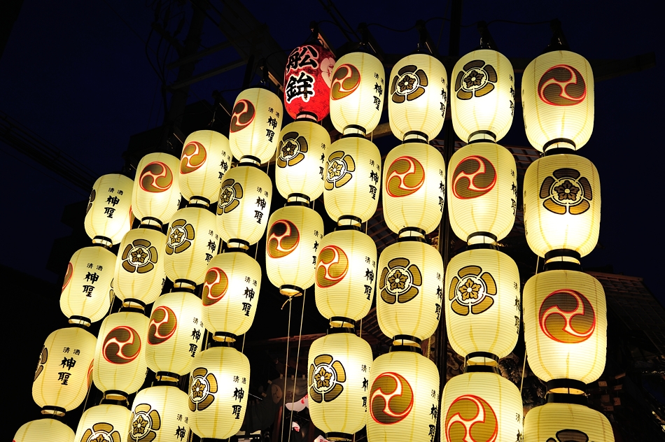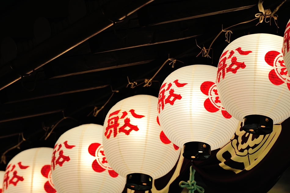 | 駒形提灯は九列で,上部赤い提灯には舩の文字、白い提灯には清酒神聖の文字が入る |
