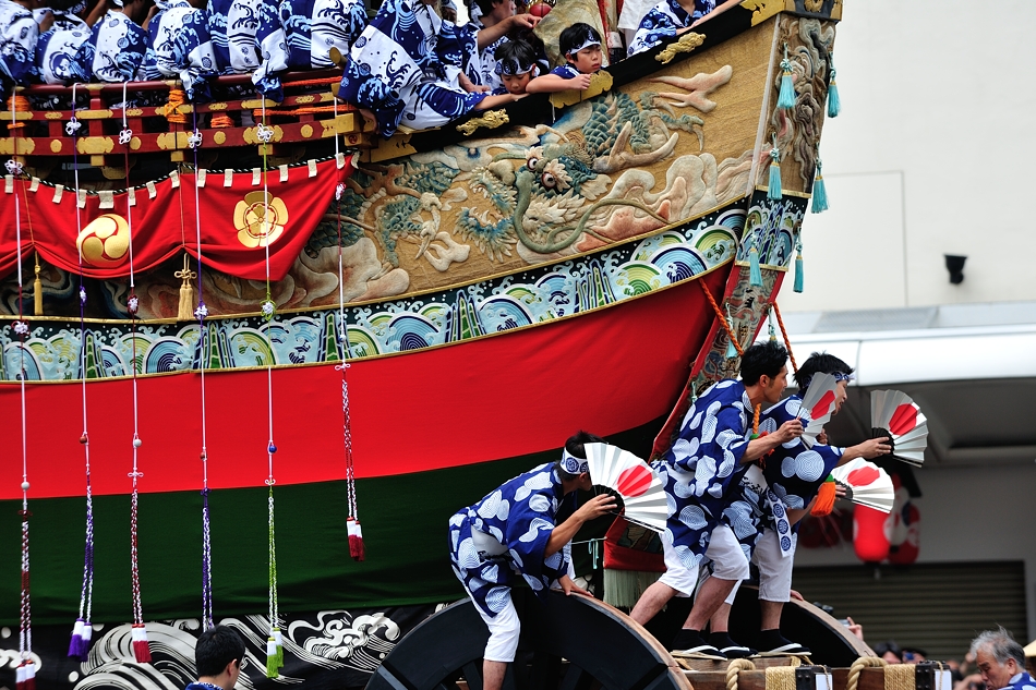 | 辻廻しは前輪の上にも音頭取りが乗り扇子で合図を出す。 |