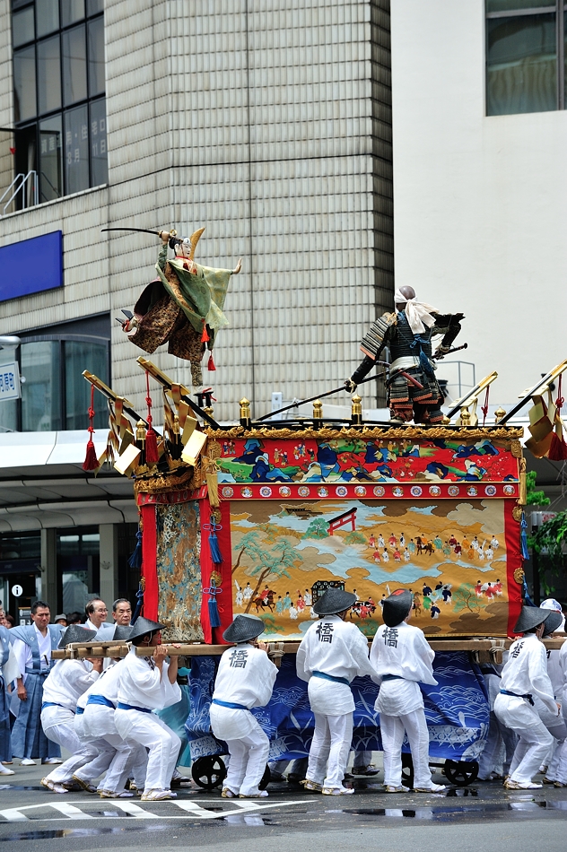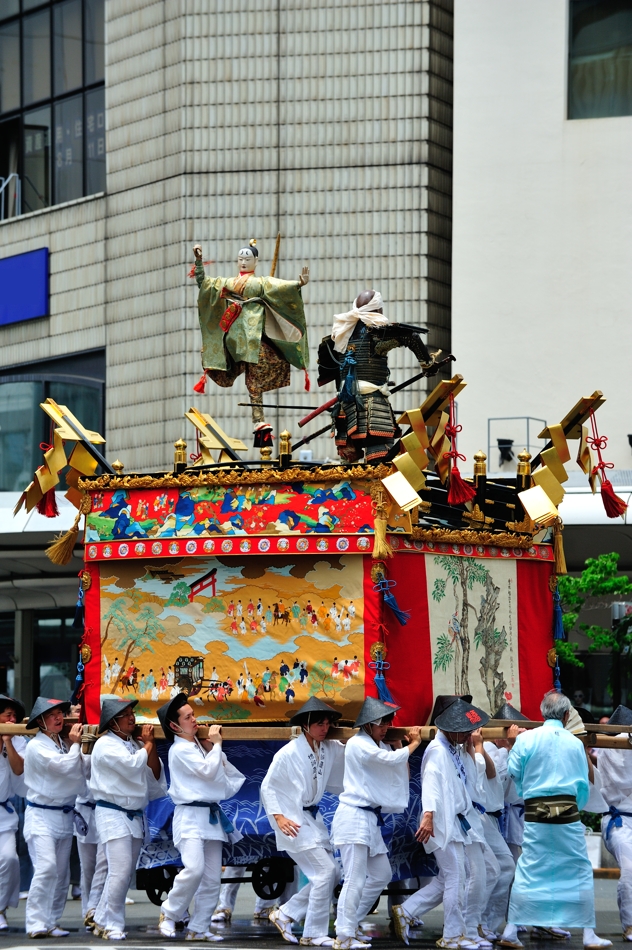 後祭の先頭,くじ取らずの橋弁慶山は謡曲「橋弁慶」を題材とし,五条大橋の上で弁慶と牛若丸が戦う動きのある姿。牛若丸の人形は足元の一本の金具のみで支えられている。