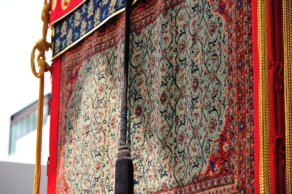 | 後祭巡行で四条通を西に向かって進行してきた南観音山。前懸は平成二十六年(2014)に復元新調された「異无須織(いむすおり)」ポロネーズ絨毯を使用。 |