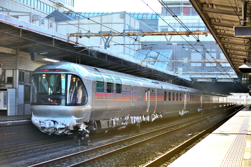 EF510‐510号機牽引の上りカシオペアが大宮に到着。雪を付けた最後尾のカハフE26‐1はハイデッカー構造の電源車で,床下にディーゼルエンジンと交流発電機2組を搭載し編成の電源を担っています。床上はラウンジカーになっており,展望室や売店用スペースも設けられています。 | ||||||||||||||||||||||||||||||||||||||||||||||||||||