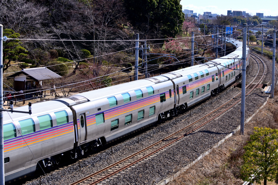 EF81 95号機に牽引されるE26系カシオペア編成。下り列車ではカハフE26が機関車の次位になるため前面展望は塞がれますがEF81の車体越しに斜め前の視界を楽しめそうです。一方,ハイデッカーのラウンジ部の側窓も広く,ゆったりした眺望が旅行気分を上げてくれますね。 | ||||||||||||||||||||||||||||||||||||||||||||||||||||