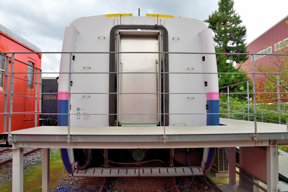 妻面。新ニシ,定員64,形式 E224,自重39.6tの標記。ここから外幌の様子が観察できます。貫通路は塞がれており,右下に新たに設置されたエアコンの室外機が見えます。 (2024/09/20追加) |