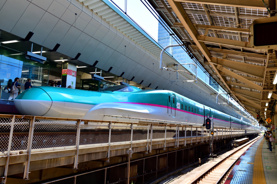 E5系には"はやぶさ"をイメージしたJR東日本のロゴマークが入っています。3月26日の北海道新幹線 新青森‐新函館北斗間開業直前で,はやぶさ17号は新青森行きでした。 | |||||||||||||||||||||||||||||||||||||||||||||||||||||||||||||||||||||||||