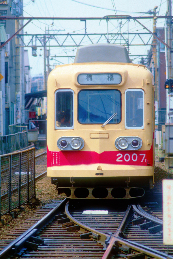 | No.121‐33 1986年3月17日 2000形 2007B+C+A 普通 楠橋行 北九州本線 西黒崎→黒崎駅前 1980年に増備編成として導入された2007ABC。上の写真の2005と比べるとワイパーが中央窓の下に移り,方向幕も大型化しています。 |