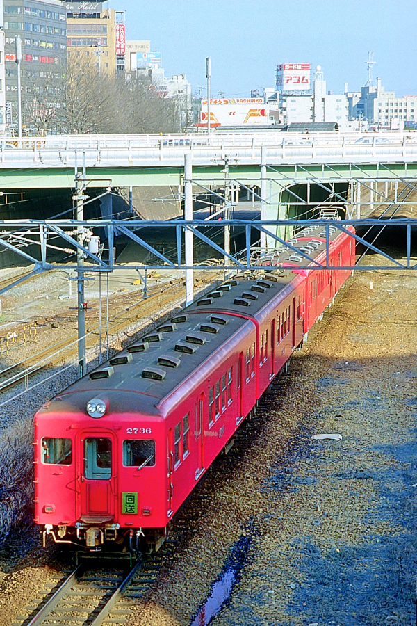 | No.144‐01 1987年3月8日 3730系 3736F他 ク2736他 4両 回送 名古屋本線 ナゴヤ球場前→金山橋 豊橋 モ3700‐ク2700+モ3736‐ク2736 新岐阜 3730系の回送。手前はク2736。 (2024/04/26シャドー調整) |