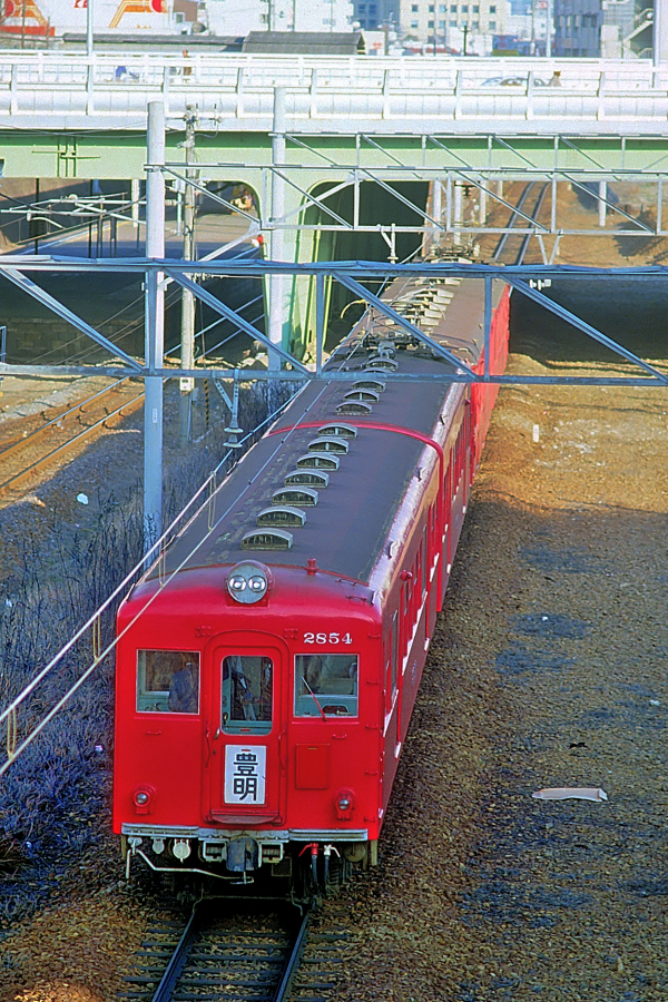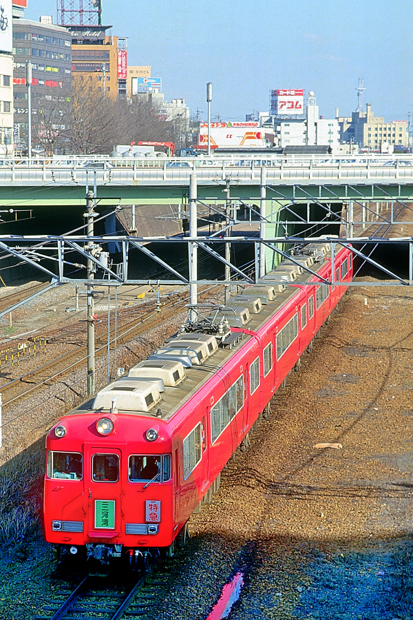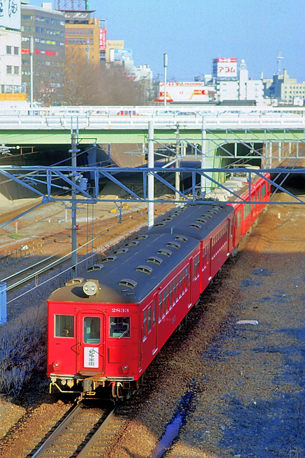 | No.144‐06 1987年3月8日 3800系 2833他 4両 普通 知多半田行 名古屋本線 ナゴヤ球場前→金山橋 知多半田 系列不明2両+モ3833‐ク2833 弥富 3800系の知多半田行き普通電車。2つ上の写真の弥富行きが増結の上,折り返し。 (2024/04/26シャドー調整) |