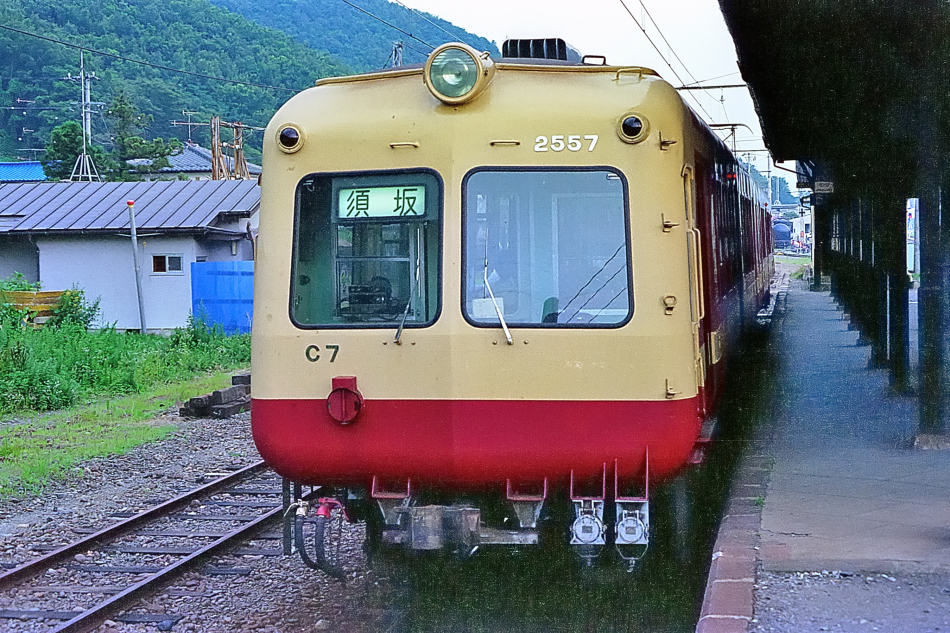 須坂 クハ2557‐モハ2707 屋代 須坂行きの方向幕を表示して屋代に停車中の2500系。C7と表記されています。2両編成がC編成と呼ばれていました。2500系はもと東急の青ガエルこと5000系で,長野‐善光寺下間の地下化に伴いA‐A基準車両が必要になり導入されました。 (2024/05/02シャドー調整) |