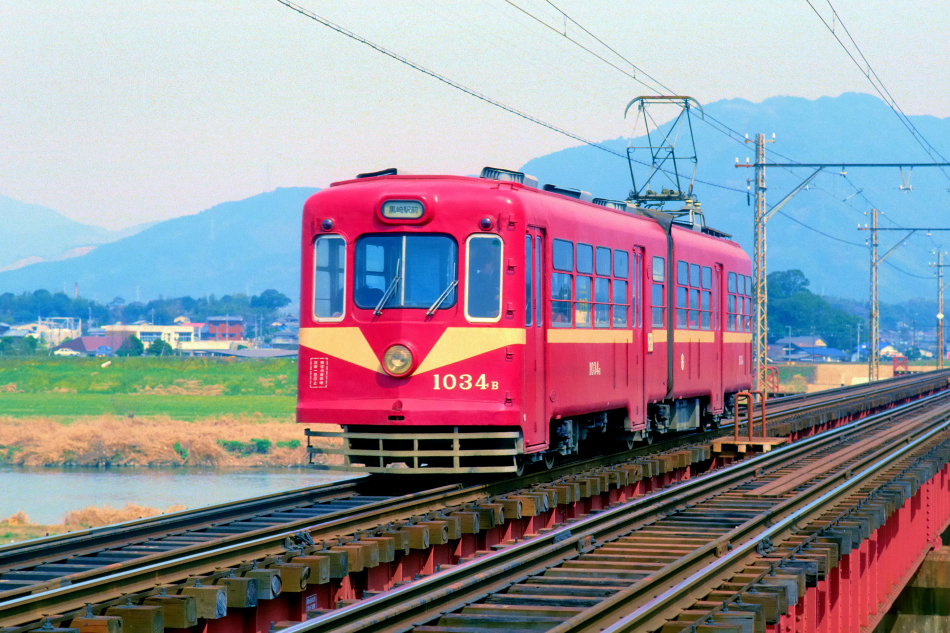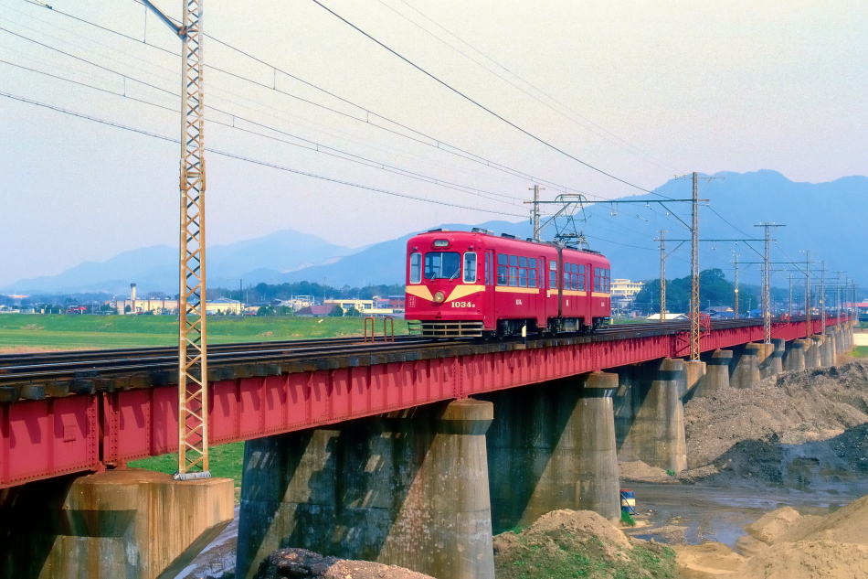 筑豊電鉄の遠賀川橋梁をわたる1000形1034号。1985年3月に西鉄→筑豊電鉄に譲渡されました。橋梁はポピュラーなプレートガーター橋で,所々に待避所を設けているだけで作業員の歩行用通路や柵は一切設けられておらず写真撮影には最適でした。このあと1987年に2100形に改番されています。 | |||||||||||||||||||||||||||||||||||||||||