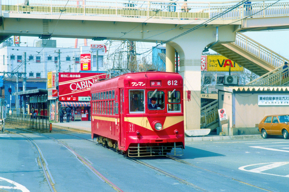砂津に向け黒崎駅前電停を発車し併用軌道に出てきた612号。上の写真の608号と比べて前面の改造されていないためかなり印象が異なります。写真後方は黒崎駅前電停で,黒崎駅前‐熊西間は専用軌道となっています。このあと,1992年10月25日に砂津‐黒崎駅前間が廃止となり,1999年12月22日には黒崎駅前電停が黒崎駅西地区再開発ビル1階に移転,2000年11月26日には北九州本線が廃止となって黒崎駅前‐熊西間は筑豊電鉄が承継しました。 | |||||||||||||||||||||||||||||||||||||||||