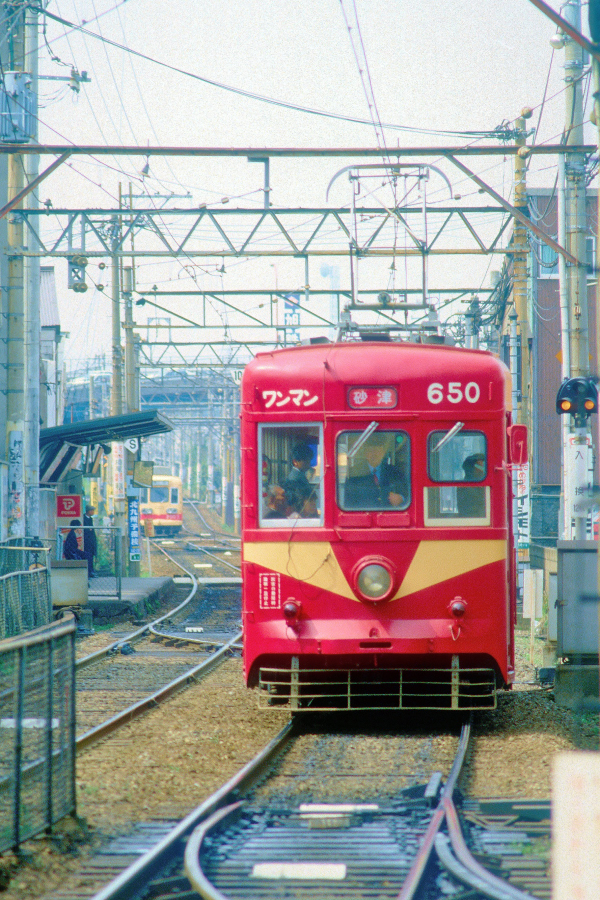 | No.121‐33 1986年3月17日 600形 650号 普通 砂津行 北九州本線 西黒崎→黒崎駅前 黒崎駅前から専用軌道となっている区間を撮影。砂津行きの650号が黒崎駅に向かって走行,後方は筑豊電鉄2000形連接車。 |