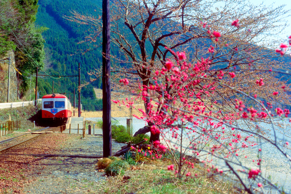 金谷 モハ313‐クハ513 千頭 遅咲きの紅梅と塩郷停車中の313編成。この付近はその後の県道77号線拡幅工事と護岸工事で本線が5mほど大井川寄りに寄せられ,その際にプラットホームが線路の県道側に移設されています。 |