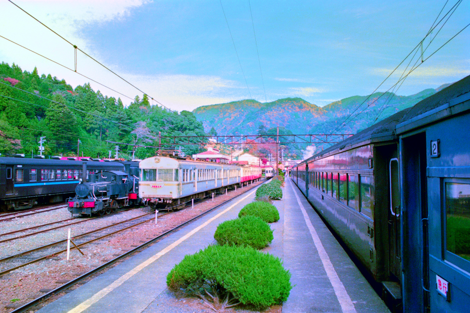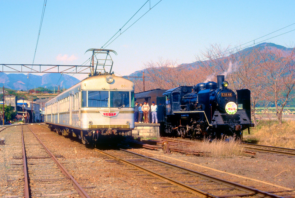 | No.47‐29 1984年4月8日 左 6010系 モハ6011他 2両 普通 千頭行 右 C5644 旧客3両 ラーメン紀行 明星号 大井川本線 家山 |
