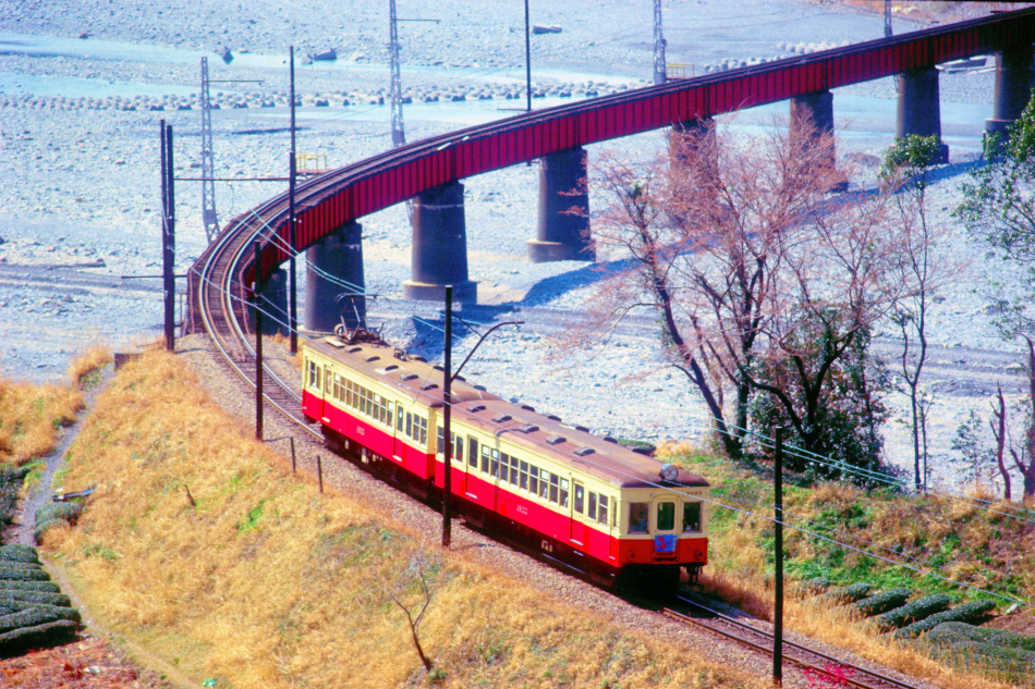 金谷 モハ3822‐クハ2822 千頭 築堤から右にカーブし大井川第一橋梁に差し掛かる3800系。名鉄から譲渡された車体と主要機器を用いて旧型車を更新した17m級の2扉車で,側面には名鉄フォントのナンバーが貼られています。 |