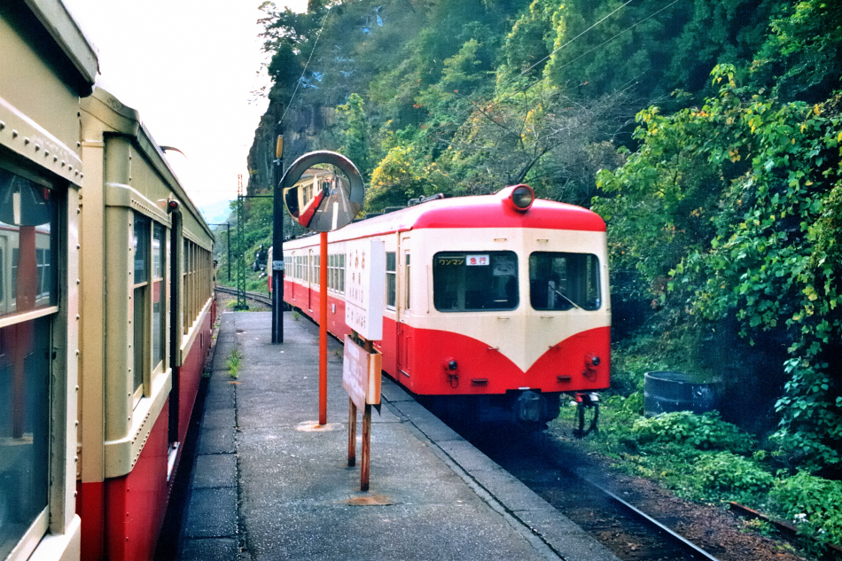 金谷 モハ311‐クハ511 千頭 撮影時点では3扉車でしたが,この後1988年4月に中央の客用側扉を潰して2扉車に改造,クロスシートを設置して1988年まで活躍しました。 |