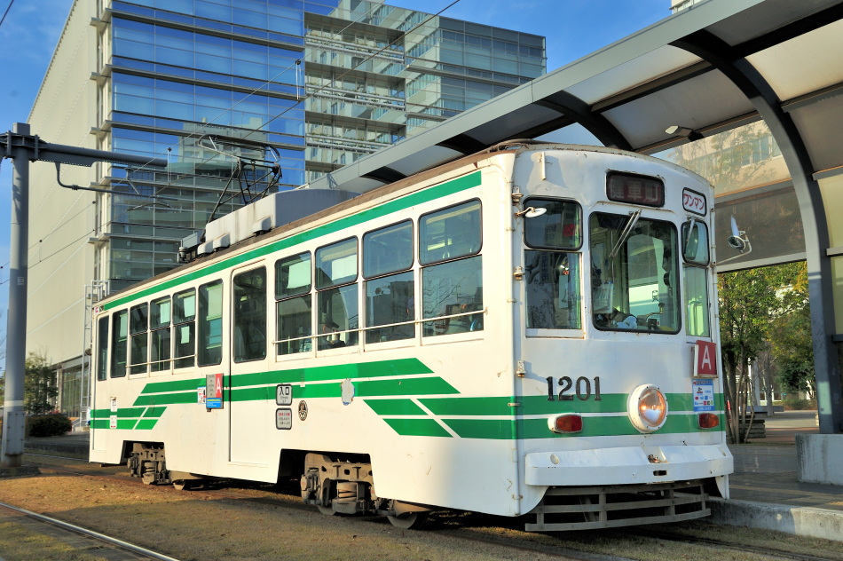 二本木口電停に停車中の1201号。 | ||||||||||||||||||||||||||||||||||||||||||||||||||||||||||||||||||||||||||||||||||||||||||||||||||||||||||||||||||||||
