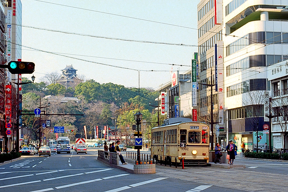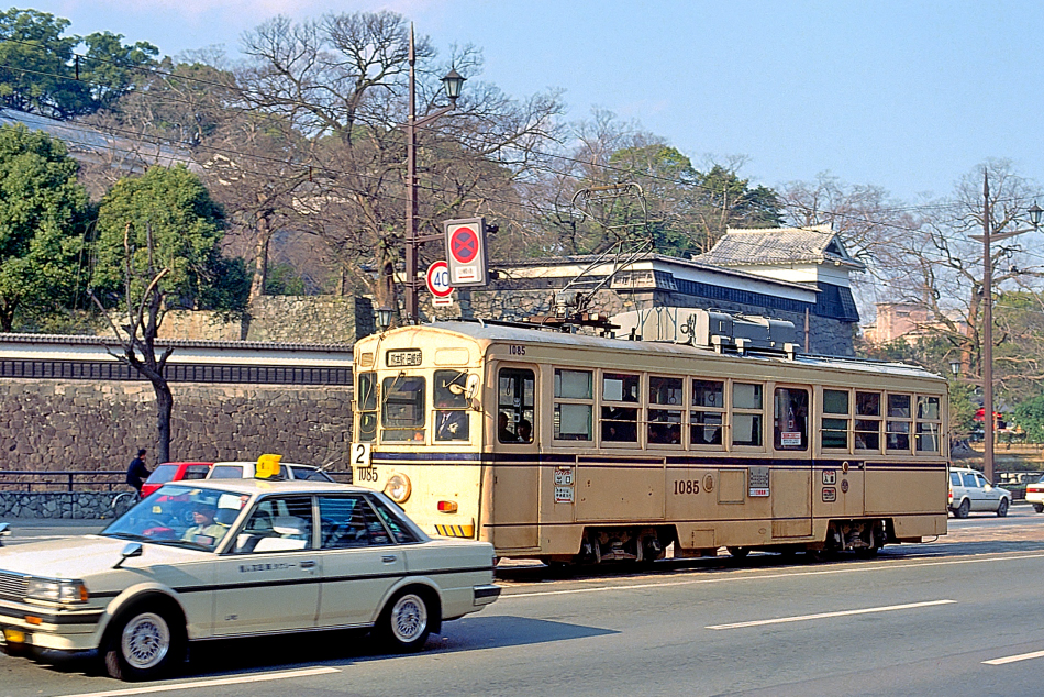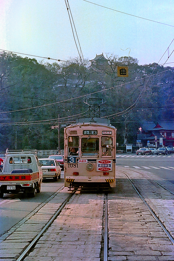 | No.N8306‐13 1983年3月11日 1080形 1081号 3系統 上熊本行 幹線 熊本城・市役所前←通町筋 後続電車から撮影した熊本城前をゆく1081号。 (2017/02/25追加 2024/05/15色調整) |