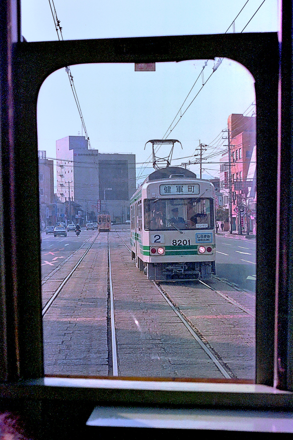 | No.N8306‐12 1983年3月11日 8200形 8201号 2系統 健軍町行 水前寺線 交通局前-味噌天神前 インバータ電車8201号「しらかわ」との出会い。撮影地調査では正面の熊本中央信用金庫のビルをGoogleストリートビューで確認できました。 (2017/02/25追加 2024/05/15色調整) |