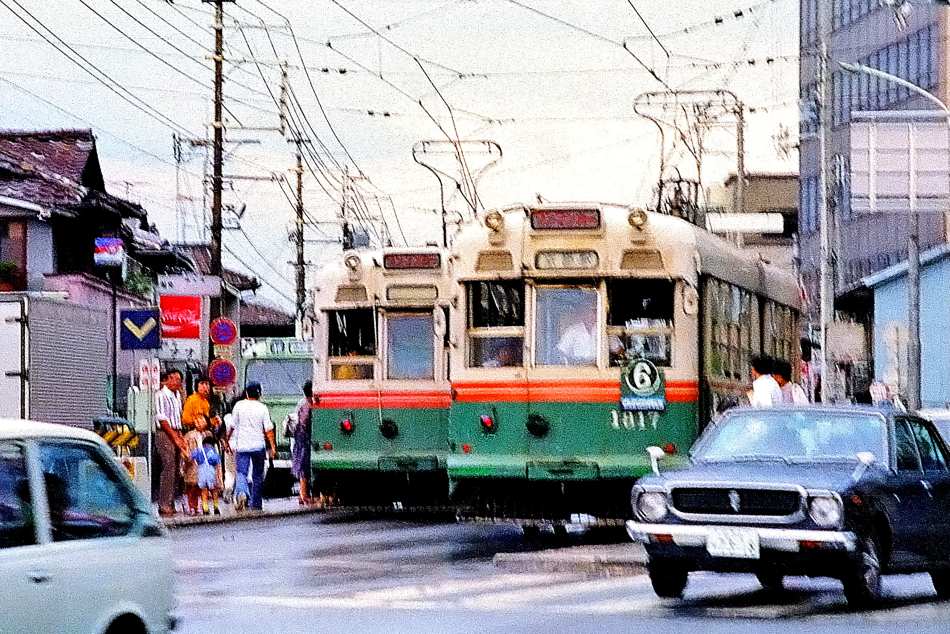 ブレてしまっていますが,狭い五条坂電停に停車する京都駅行きの1817と烏丸車庫方面行き1800形のすれ違いです。撮影からほぼ30年経過しており,周りの車もみな古い。 (2024/05/08ワイド化) |