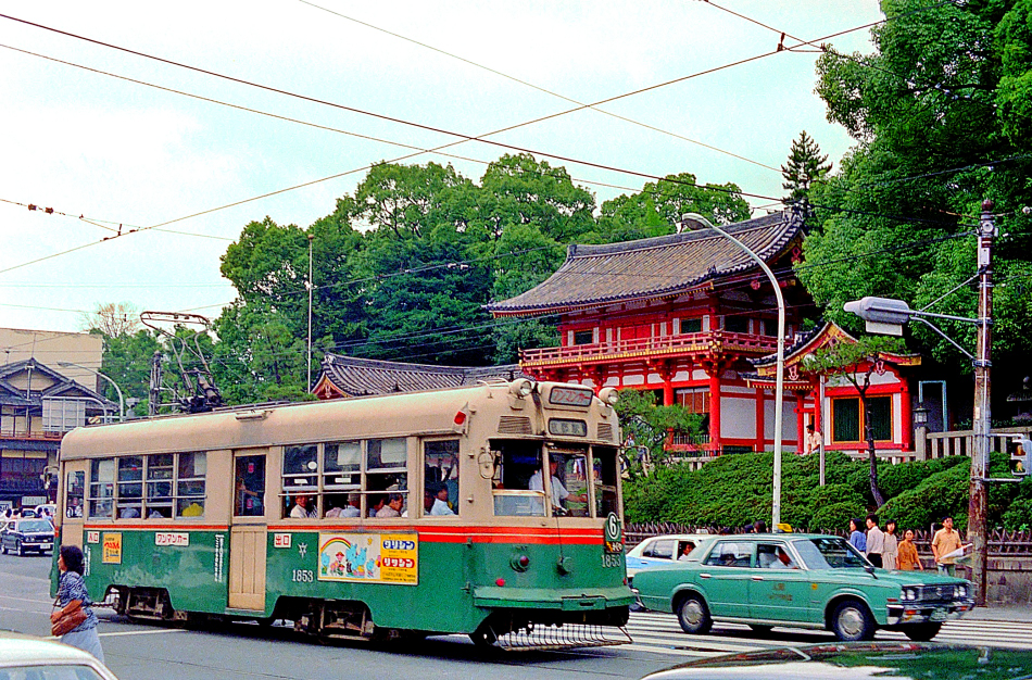 京都市電でも私にとって最も印象の深い祗園石段下。京都駅行きの1853。祝日の国旗をつけています。四条線在りし頃は河原町から八坂神社を目指して東進してきた市電が南北どちらにも曲がれるようになっていました。そして,市電通過の度にポイントを渡る音が響いたものでした。 (2024/05/08ワイド化) |