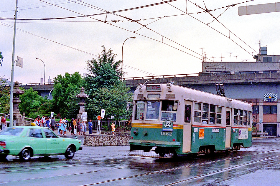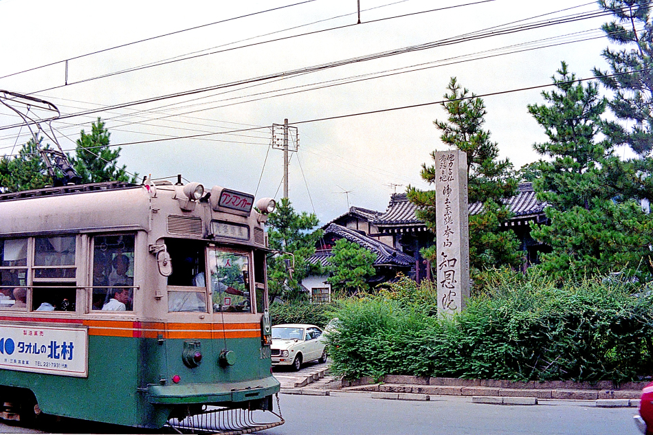 この時期,京都の市電は最末期を迎え,馴染みの深かった丸太町線や河原町線も既になく,外周線のみ運転されていました。それもこの9月30日で全廃になると聞き,小雨降る敬老の日,愛機ニコマート片手に上洛しました。五条坂に到着する頃には幸い雨も上がって市電最後の活躍を撮影できました。東山五条,西大谷本廟前をゆく22系統の1800形。 (2024/05/08ワイド化) |