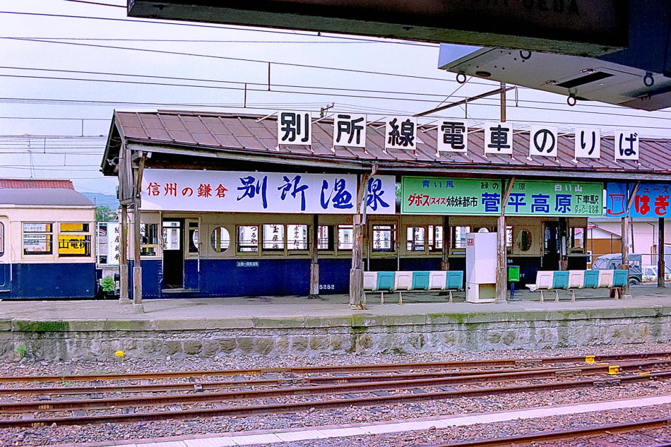 温泉行きのローカル電鉄の雰囲気満点の上田駅停車中の丸窓電車。左側はサハ62っぽいです。 (2024/05/03シャドー調整) |